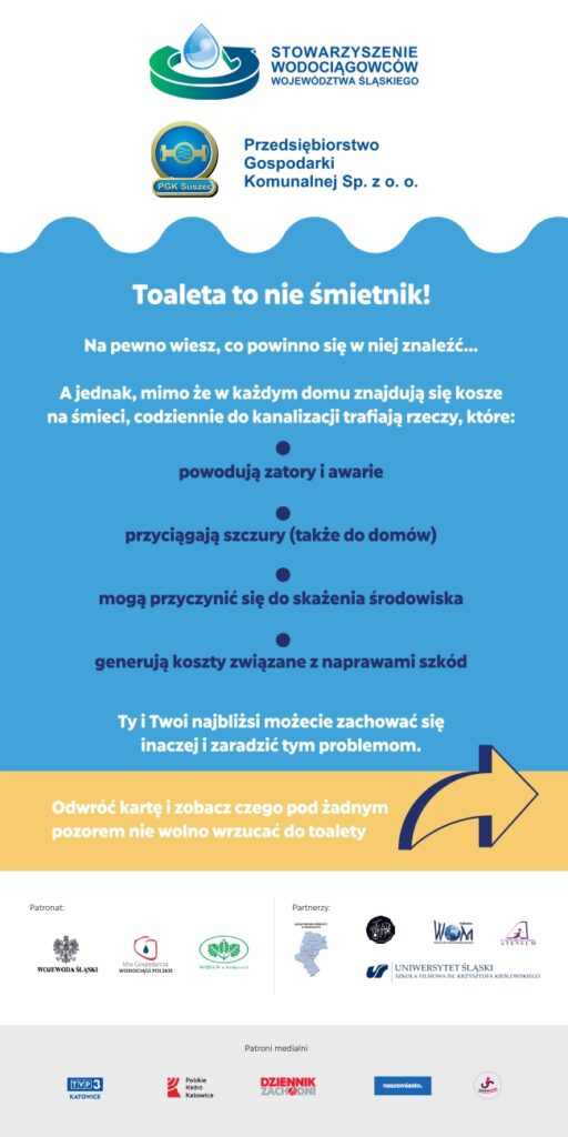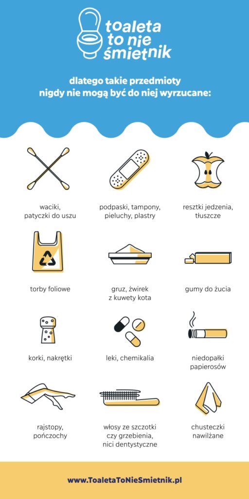W dalszym ciągu Spółka odnotowuje kiepską kulturę korzystania przez Mieszkańców z infrastruktury kanalizacyjnej co sprowadza się do wzrostu ilości awarii, powstawania zatorów w rurociągach, zapychania się pomp na przepompowniach ścieków jak i rurociągów tłocznych, znaczne obciążenie części mechanicznego oczyszczalnia ścieków komunalnych na terenie oczyszczalni ścieków. Do kanalizacji trafia dosłownie wszystko. Pamiętajmy, że toaleta to nie śmietnik i służy do odprowadzania ścieków, a nie odpadów stałych generowanych w naszych gospodarstwach, które powinny trafiać do odpowiednich koszy na śmieci. Bardzo „popularnym” odpadem trafiającym do kanalizacji są szmaty, mopy, ścierki, chusteczki nawilżane nierozpuszczalne w wodzie, środki higieny osobistej (tampony, podpaski, golarki, żyletki, pieluchy), tłuszcze. Wszystkie te rodzaje odpadów nie powinny trafiać do kanalizacji sanitarnej. Pełny katalog substancji, których wprowadzenie do urządzeń kanalizacyjnych jest zakazane definiuje art. 9 Ustawy z dnia 7 czerwca 2001 r. o zbiorowym zaopatrzeniu w wodę i zbiorowym odprowadzeniu ścieków (Dz. U. 2024 poz. 757). Do kanalizacji sanitarnej zabronione jest również wprowadzanie wód opadowych, roztopowych oraz drenażowych. Zatem wszelkiego rodzaju rynny i rurociągi odwadniające nasze posesje nie powinny być włączone do infrastruktury sanitarnej.